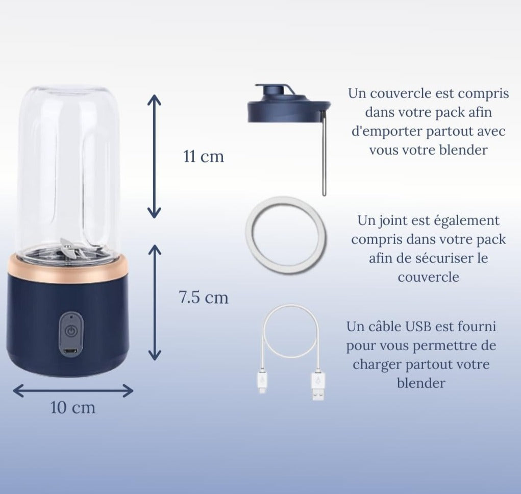 - Envisagez un produit qui vous offre la possibilité de savourer un smoothie ou un jus frais où que vous soyez ! Plus besoin de rentrer à la maison et de sortir tout votre équipement encombrant et souvent onéreux. Il vous suffit d'allumer votre Blender portable, d'y ajouter vos ingrédients et de profiter de ce moment de douceur qui vous procure une excellente source de nutriments et de vitamines.